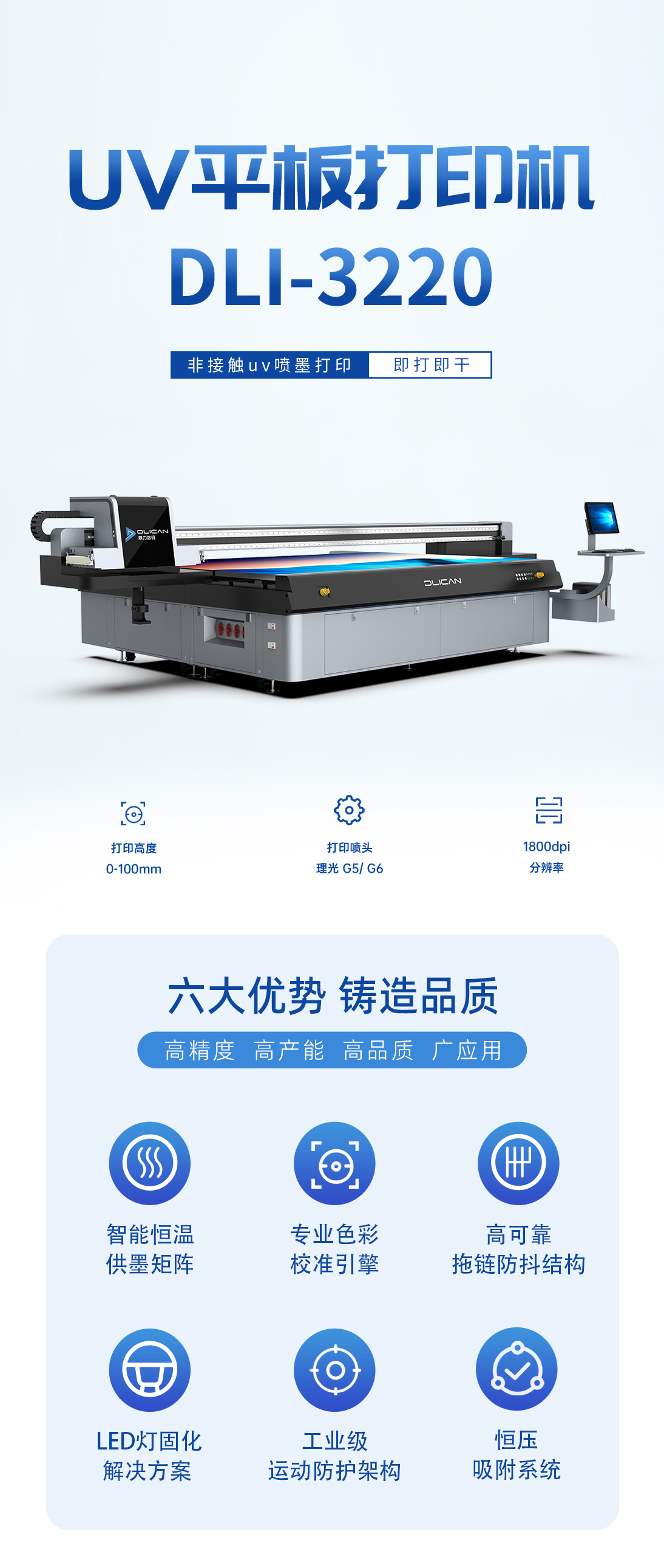 产品描述:打印尺寸3.2m*2.0m,可定制双CMYK喷头,打印速度提升75平米/小时,高效打印,支持多喷头及油墨定制方案,应对不同尺寸、软硬打印材质。