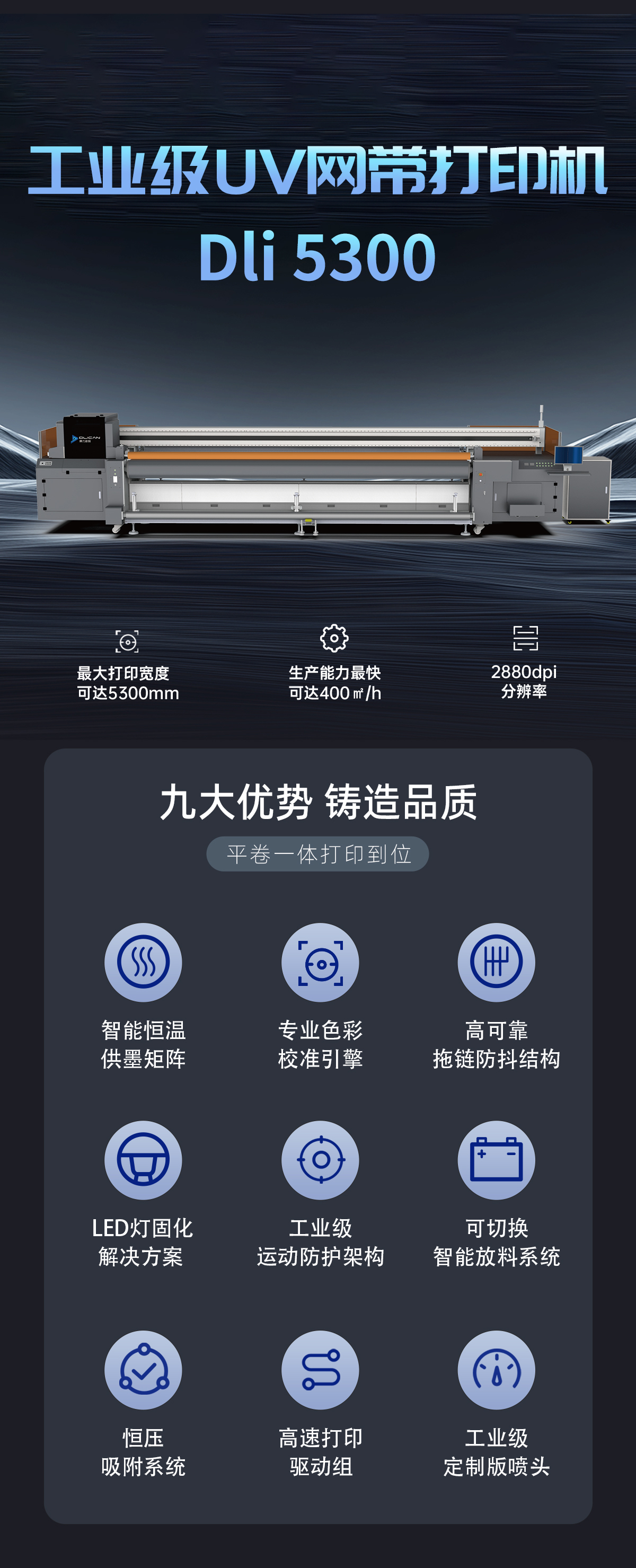产品描述:工业级UV网带打印机,打印幅面5.2米,板卷一体打印平台,应用更广泛